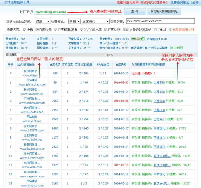 從圖上我們可以看出還可以看到對方網(wǎng)站的pr,百度權(quán)重以及導(dǎo)入導(dǎo)出鏈接數(shù)量,由于時間關(guān)系不在這里一一贅述,總之友情鏈接檢查工具是個好工具!